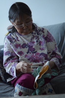 The film we exhibited: Ikpariikutiliqtu: Adding reinforcements showed renowned Inuit seamstress Ruth Sangoya, pictured above, stitching the inner seams of a sealskin kamik. The kamik is being made from a delicate white sealskin, nalua, that has been de-haired, scraped of its fat, and placed outdoors for bleaching and curing during the "frostbite weather" of the dark winter months. Adam Watson’s boots have insteps made of the same material.