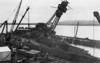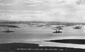 At 12.20 p.m. on Saturday 21st June 1919, the peace of Scapa Flow was broken by the clanging of a ship’s bell. It came from the battleship SMS Friedrich der Grosse, the former flagship of the German High Seas Fleet, interned in Scapa Flow and awaiting its fate to be decided at the peace talks that would officially end World War I. The bell signalled the crew to ‘abandon ship’; they had opened the sea-cocks and ‘scuttles’ (portholes that could be opened for ventilation) and jammed open the watertight doors, allowing the sea to flood the ship. By 5.00 p.m. 52 of the 74 ships of the former German Navy lay on the seabed.