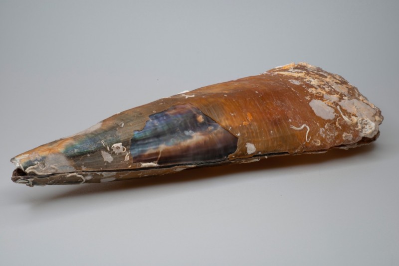 We could see just a small part of the mussel sticking out from the sediment with its bright yellow mantle tissue. This species of bivalve mollusc is a rarity and is usually found in much deeper waters. It is important from an ecological point of view because it produces protein byssus threads, which bind into the seabed and stabilise the sediment. It is therefore supporting the stability of the environment and creating a habitat in which other species can live. When we returned to the surface we were excited to share the news with our colleagues, and we were met with disbelief. If we had not got the photograph I do not think that they would have believed us. Oftentimes now when I dive the wreck of Karlsruhe I go back to this spot to check that the Fan Mussel is still there, hiding among the horse mussels and brittlestars. The species can live for decades and was probably common in Scapa Flow in times gone by. When I spoke with Exhibition Assistant Katy Firth about my experience, she said that we could check in the Stromness Museum collection to see if there were any historical specimens of Fan Mussel to include in the exhibition.