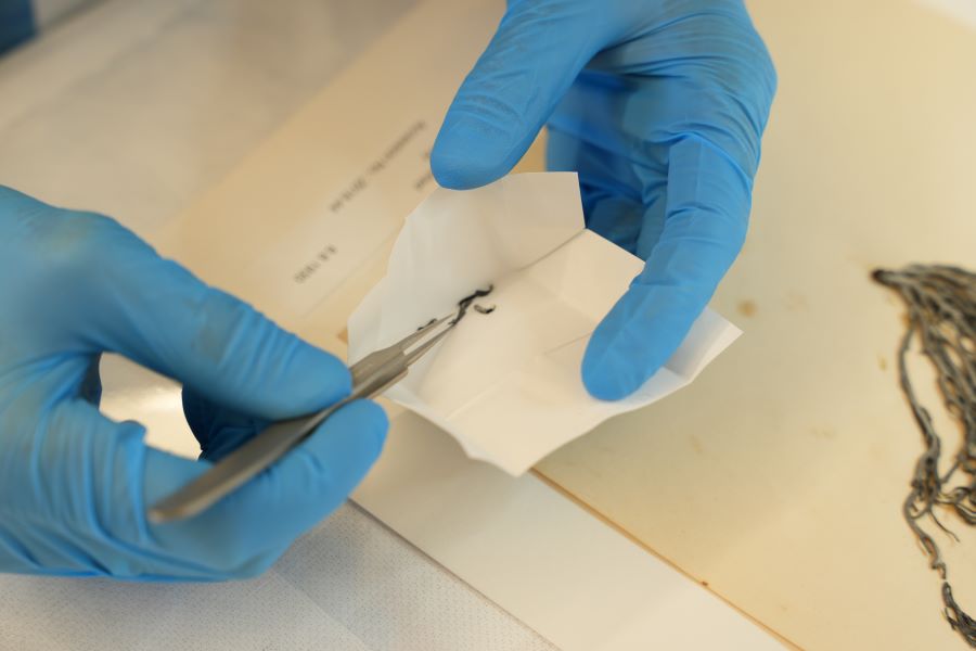 Twelve specimens required some form of interventive treatment to stabilise their condition, which often included re-adhering lifting parts, unfurling crumpled areas to regain their original form via humidification, or creating fragment packets to safely store detached parts of specimens.