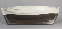 Model of a clinker built yole. Painted black on the bottom, white in the middle with a thin black line along the top. Black interior. Might have been used for sailing.