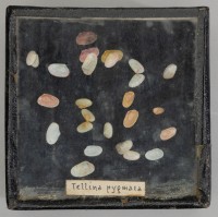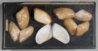 Class: Bivalvia. 23 specimens. 11 have both valves still attached, 7 left valves and 5 right valves. Very small, thin and semi translucent.