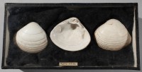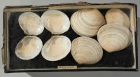 Class: Bivalvia. 3 specimens. 1 with both valves still attached, 1 left valve and 1 right valve, but given their size difference are unlikely to be from the same animal.