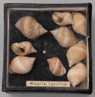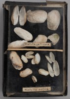 Class: Gastropoda. 8 specimens. Smaller sepcimens and with a wider variety of colours. Ranging from greyish-purple, brown and white. They are also considerably thinner than those in box 1.