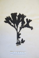 Pressed seaweed specimen. Small dark red stalk with 6 leaves.