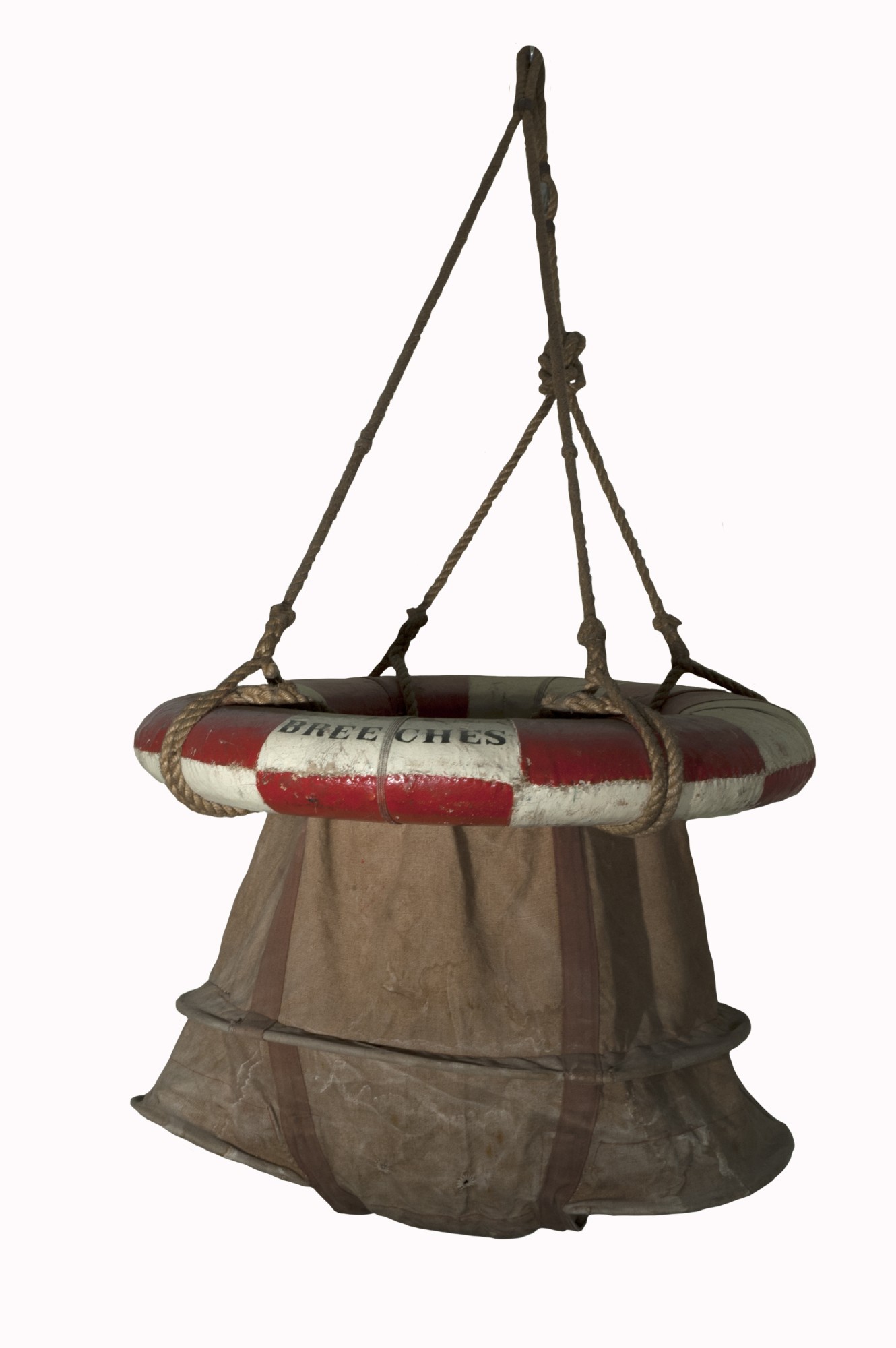 Breeches buoy. A red and white life belt, or flotation device with a canvas leg harness.