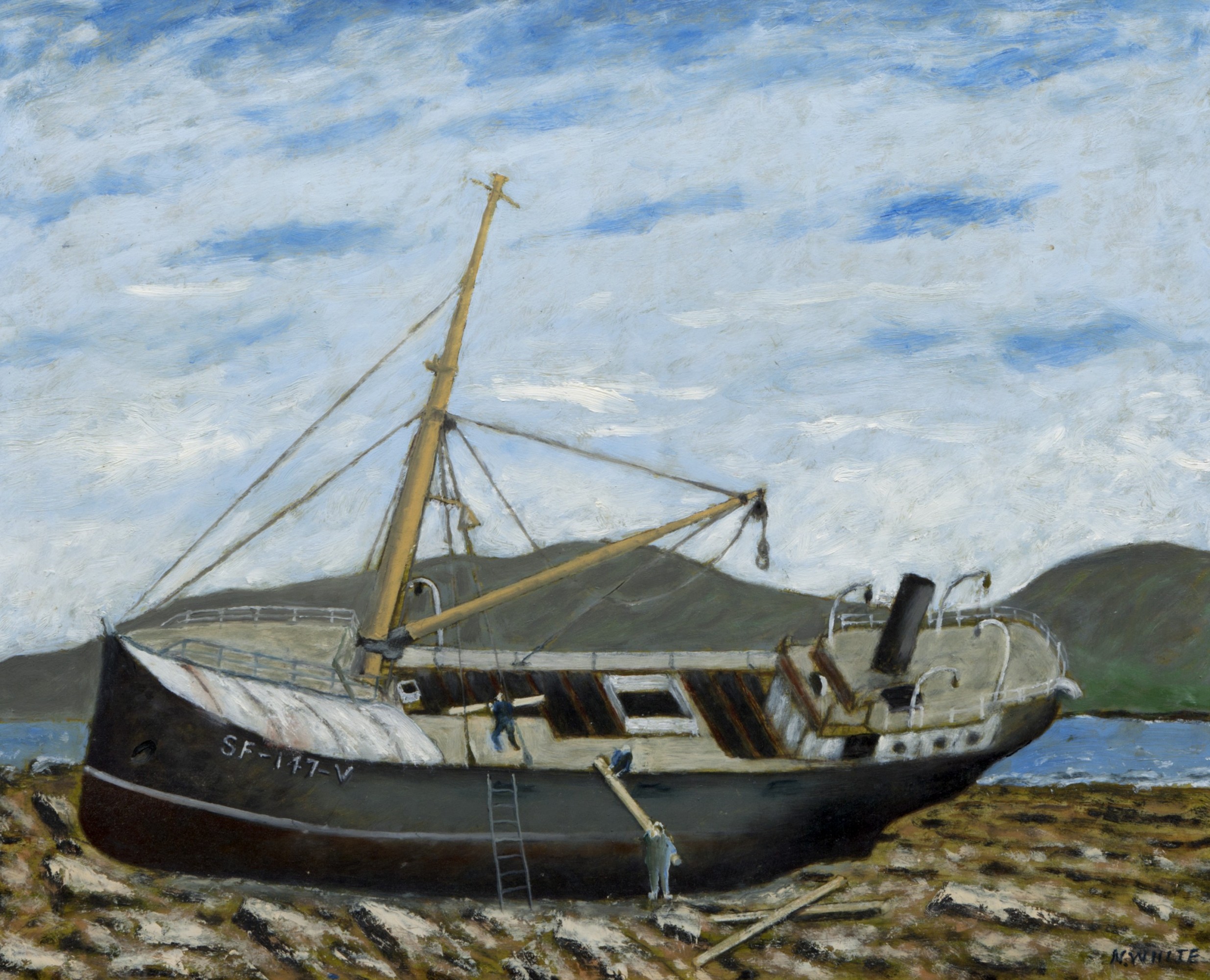 Oil painting on board of the Norwegian whaler M V Norholmen by amateur artist Nelson White. It shows the boat washed up on the shore at Stromness. It is depicted at an interesting angle with 3 men unloading timber. Hoy is in the background.