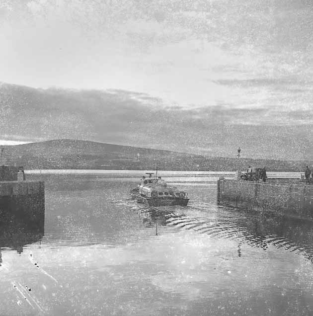 The Hydrofoil 'Shadowfax' leaving Kirkwall Basin, September 1964. See Orcadian 24/9/1964, page 5.