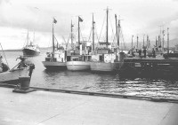 A busy day in Stromness Harbour. On the left is the M.V. St. Ola, in the centre is the Training Ship 'Prince Louis II'.