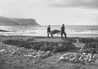 Workers for an english firm collecting 'tangles' at Warbeth, near Stromness. They are stacking them to dry before shipment South, 1956. See Orcadian 1/11/02, page 3.