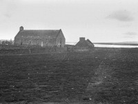 Feeding the hens in Orphir, with Hoy and Graemsay in the background. Date unknown.