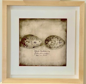 "Parasitic gull eggs, 2023, pigmented gum impressions on palladium printed on archival rag [Natural History Museum Collection, Tring, England]. Specimen collected by Dr. John Rae on June, 1854 in Repulse Bay (Naujuut, Nunavut) while he searched for the missing John Franklin Expedition. It was later discovered that Franklin had died on June 11, 1847."