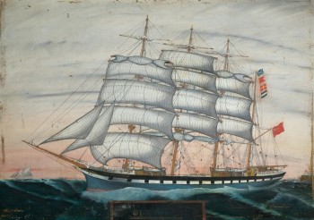 Oil painting: The full rigged ship 'Thistlebank' - assoc. Capt Sinclair of Thistlebank, Franklin Road, Stromness. Inscribed 'Thistlebank, Glasgow: painted by (inscription) 'Pict.Lima.San Diego'. On tin. Frame missing.