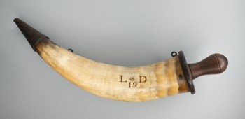 Powder horn made from natural horn with a metal tip and top lid. The letters L * D and number 19 are carved on it. It was brought back from the Arctic by Dr John Rae as a relic from the Franklin expedition of 1845.