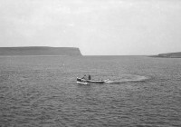 A small motor boat checking lobster creels, date unknown. Red Head, Eday can be seen in the background.