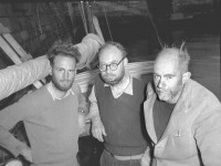 The sailing cutter 'Maid Nellie' with skipper David Regan (centre) and his two crewmen, Leslie Shephard (left) and Jon Field (right), 1959.