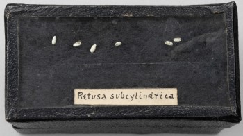 Class: Gastropoda. 6 specimens. Minute, oval-shaped, white and glossy. The aperture runs the length of the shell and there are horizontal striae which are not visible to the naked eye due to these specimenss size. Found in fine, muddy sand in the sublittoral.