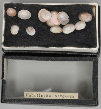 Class: Gastropoda. 12 specimens. Small, asymmetrically conical. Ranging in colour from whitish yellow, to the pale pink of the striped bands which are still visible on a number of the specimens. Can be found at the low tide line and in rock pools. Also round on smooth rocks close to its food source, Lithothamnion algae which is also pink or purple in colour.
