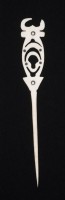 White hairpin with dark circular decoration. The top of the pin is pierece fretwork. The top is broked so it is difficult to determine the whole design. Abstract geometric.