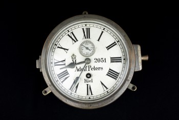 Ship's wall clock, chromium plated brass; circular. Roman numerals and second hand dial. 3 mounting lugs. Hinged face with square key lock (key missing) M (crown) 2051 printed on face. Adolf Peters, Kiel'. Removed from a ship of the German Fleet immediately after scuttling by commander Allan Stewart Robertson, RNR