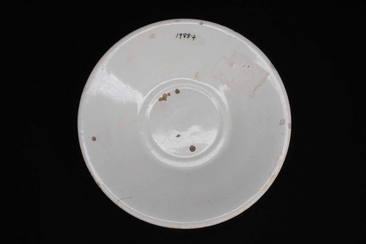White ceramic saucer, pitted in places. Stamp on the base "Bonn - Franzant.Mehle" from German Fleet.