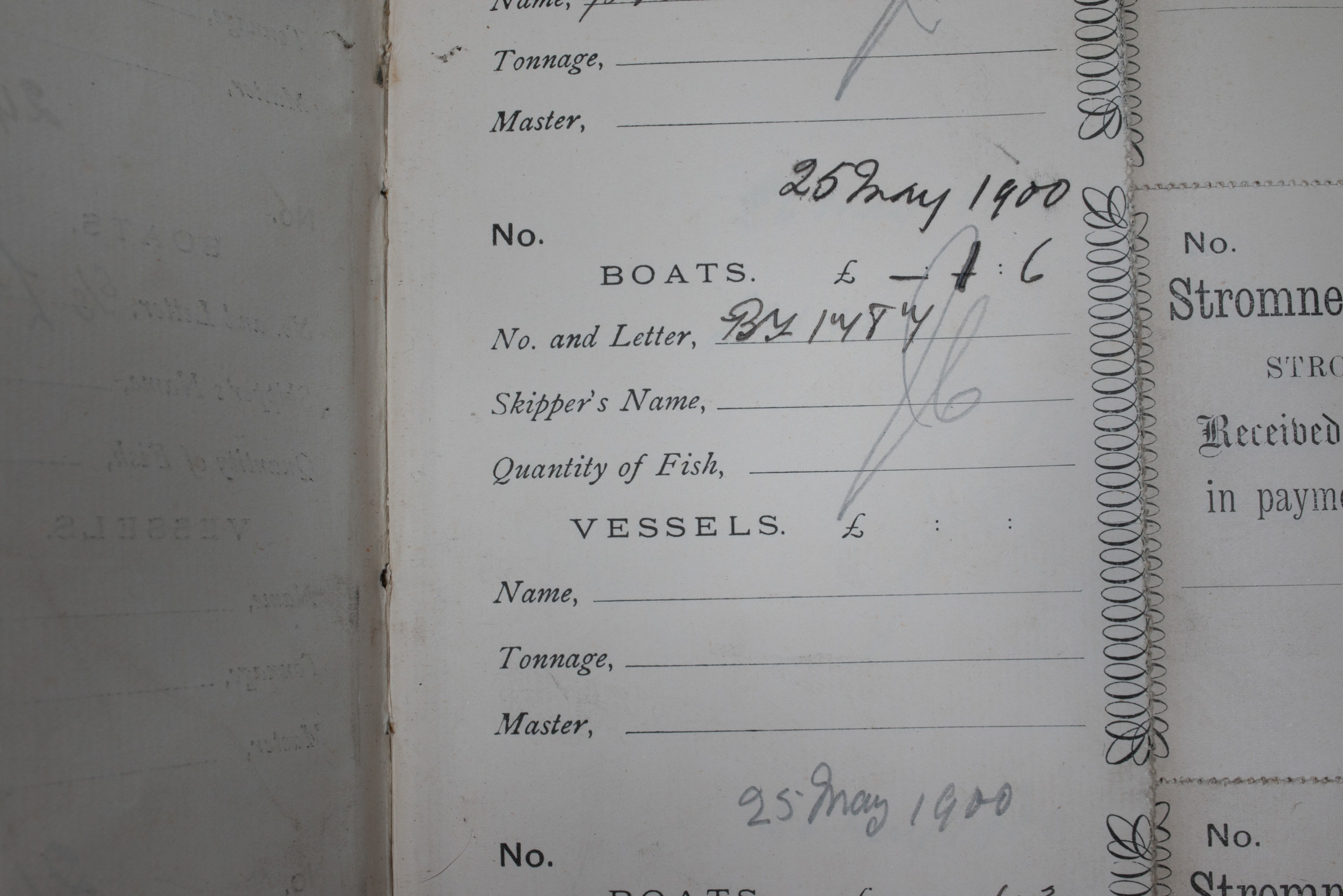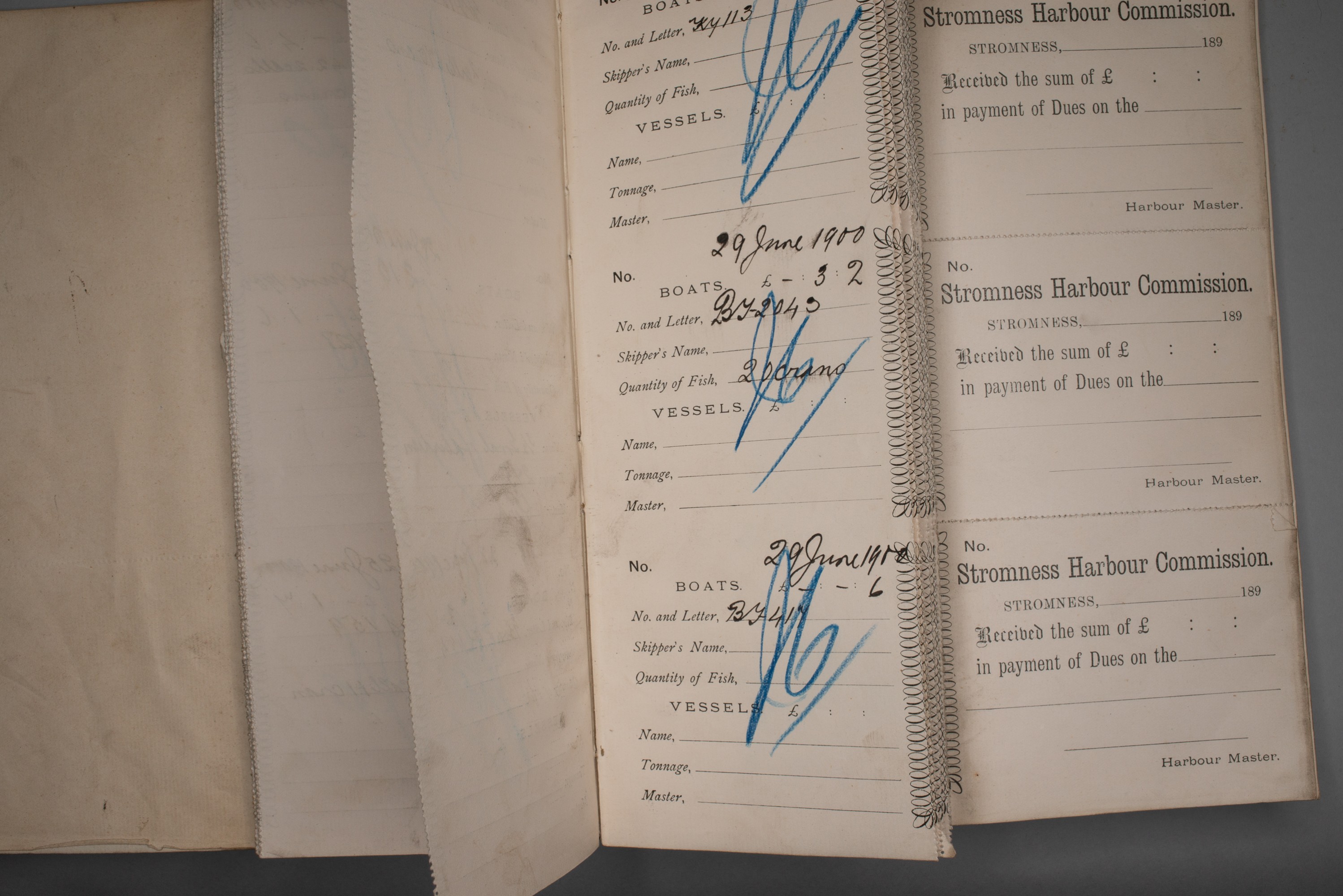 Stromness Harbour Commission Dues Receipt Book 1900/01; Weights Books (5); Telegrams Book; Book listing fishing boats in Stromness September 1917-May 1920; Posters, leaflets, letters; Lloyds List; Rules and Regulations.