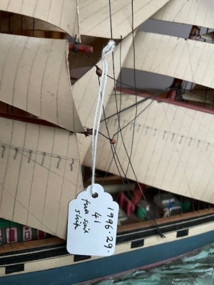 Model ship: full rigged ship with paper sails on painted flat base. Unfinished,