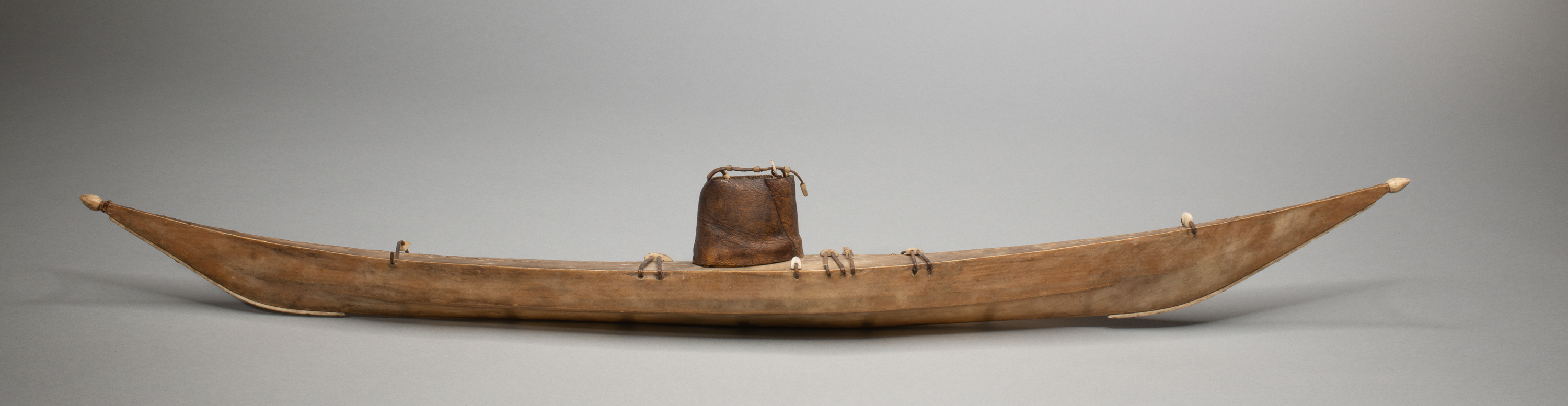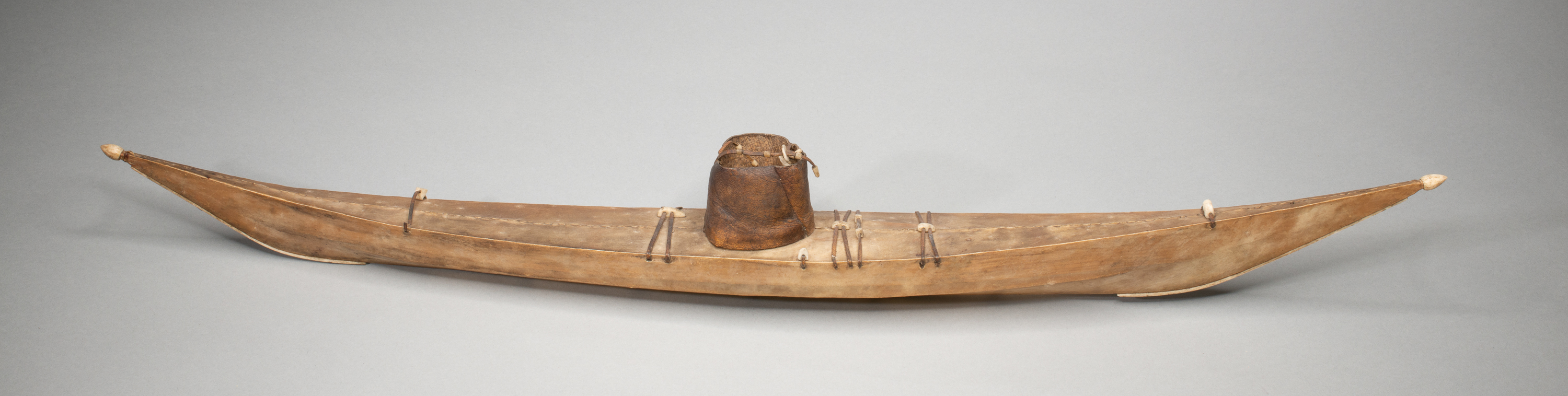 Model of Inuit kayak. Wooden fram of model covered with skin or hide. Light brown in colour. Straps of leather with bone decoration go accross the boat. The hole where the sitter is positioned has a "coning tower" to keep the sitter from getting wet or the kayak filling with water. There are straps accross the top to stop the sitter to keep them from falling out.