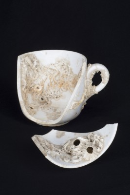 Cup (2 fragments), naval issue, from Scapa Flow, encrusted with barnacles. "Minton's, England".