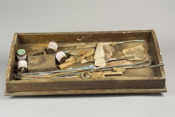 Ship-in-a-bottle maker's tool set. Twelve lengths of wire made into spatulas, brushes and knife for modelling in bottle, made and used by Isaac Wilson, Sunnybrae, Stromness, a ship's carpenter on the Port Line in the 1920s/30s. Also 4 tins of Humbol enamel paint, scraps of wood and sandpaper and an unfinished model boat: contained in a wooden tray.