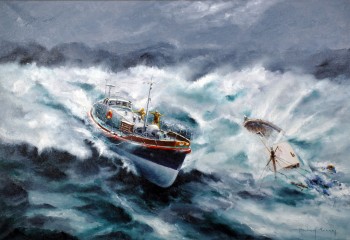 Oil painting, unglazed of the attempted rescue of the Stromness fishing boat MFV Desire by the Longhope Lifeboat "TGB" off Hoy. 27 May 1963.