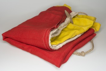 Signal flag: From wreck of boom defence net carrier 'DISPENSER' which sank in Kirkwall Bat during a storm in World War Two. All crew lost. Red with yelllow cross. 'R'. Some small holes.