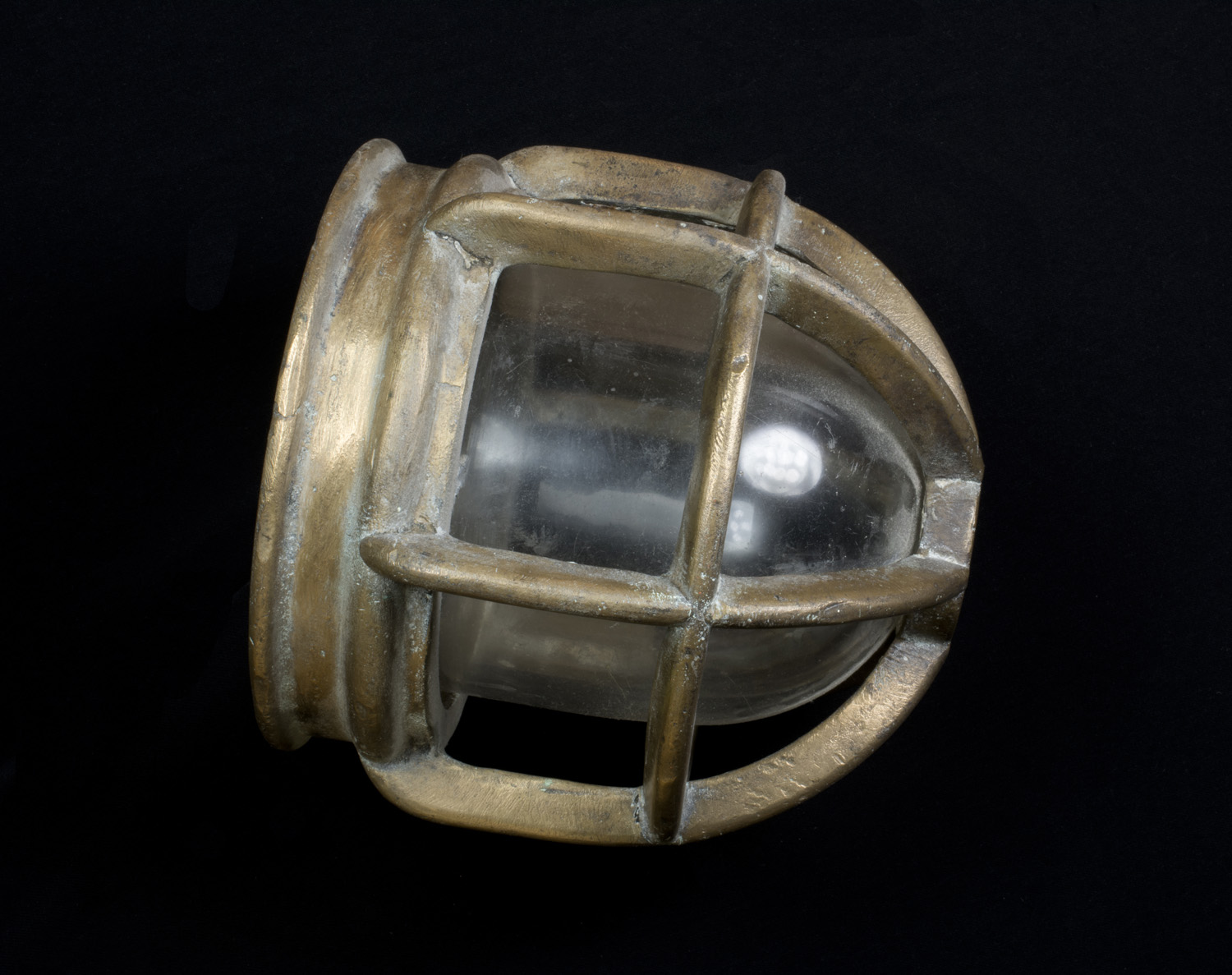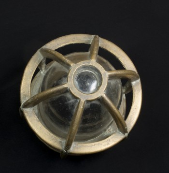 Brass lamp cage with screw thread and glass inside. Possibly from the SMS Konig.