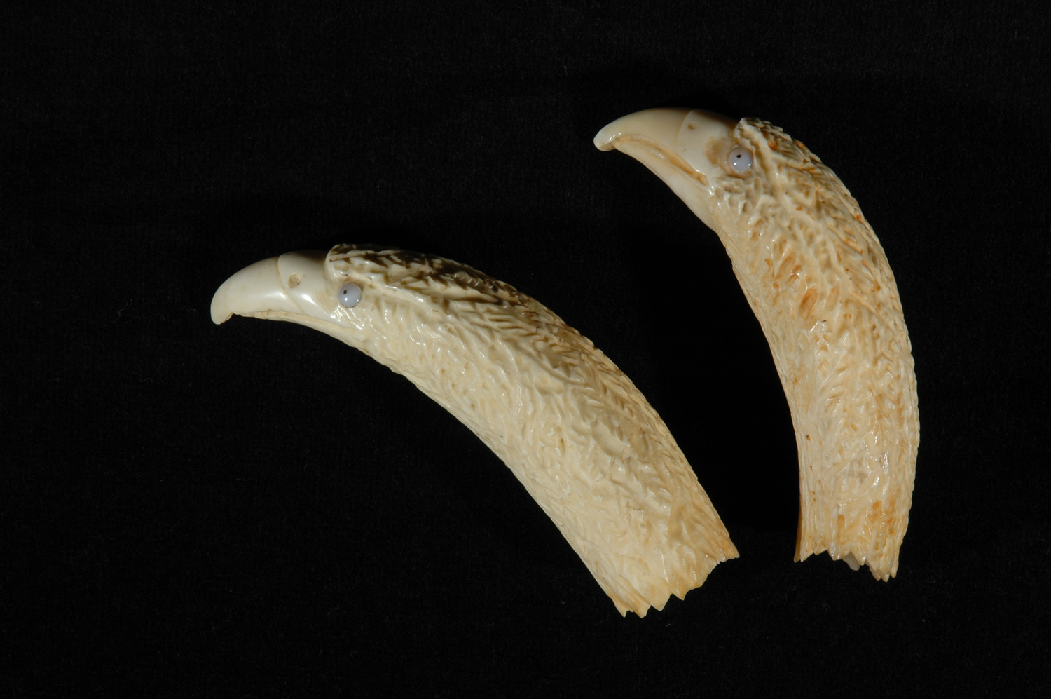 Pair sperm whale teeth carved as eagle head with glass eyes inserted.