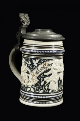 Ceramic beer tankard, with pewter lid. Lid inscribed " W Facharias 17 Dec. 1914. Ornate pattern on lid, slightly raised. Dogs head surrounded by Ivy foliage on top of handle. This is pressed down to open the lid. The body of the tankard is cream coloured ceramic with a blue glaze. It is decorated with 4 figures dancing and playing music. The slogan "Musik und Bier, Das ist mein Plasier" (music and beer that is my pleasure" is threaded through the dancing figures and foliage.
