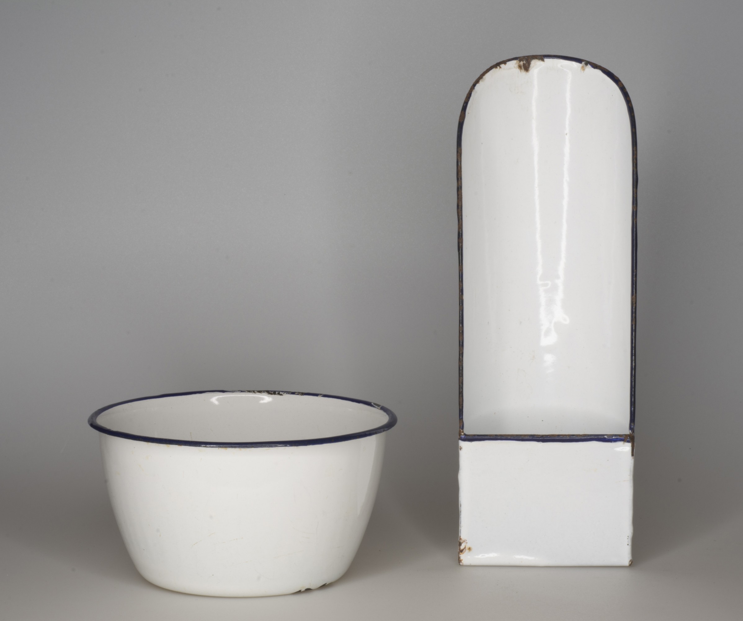 Scoops: white enamel shop serving scoop. Part of items from The Alfred Cafe, 7 Alfred Street, Stromness.