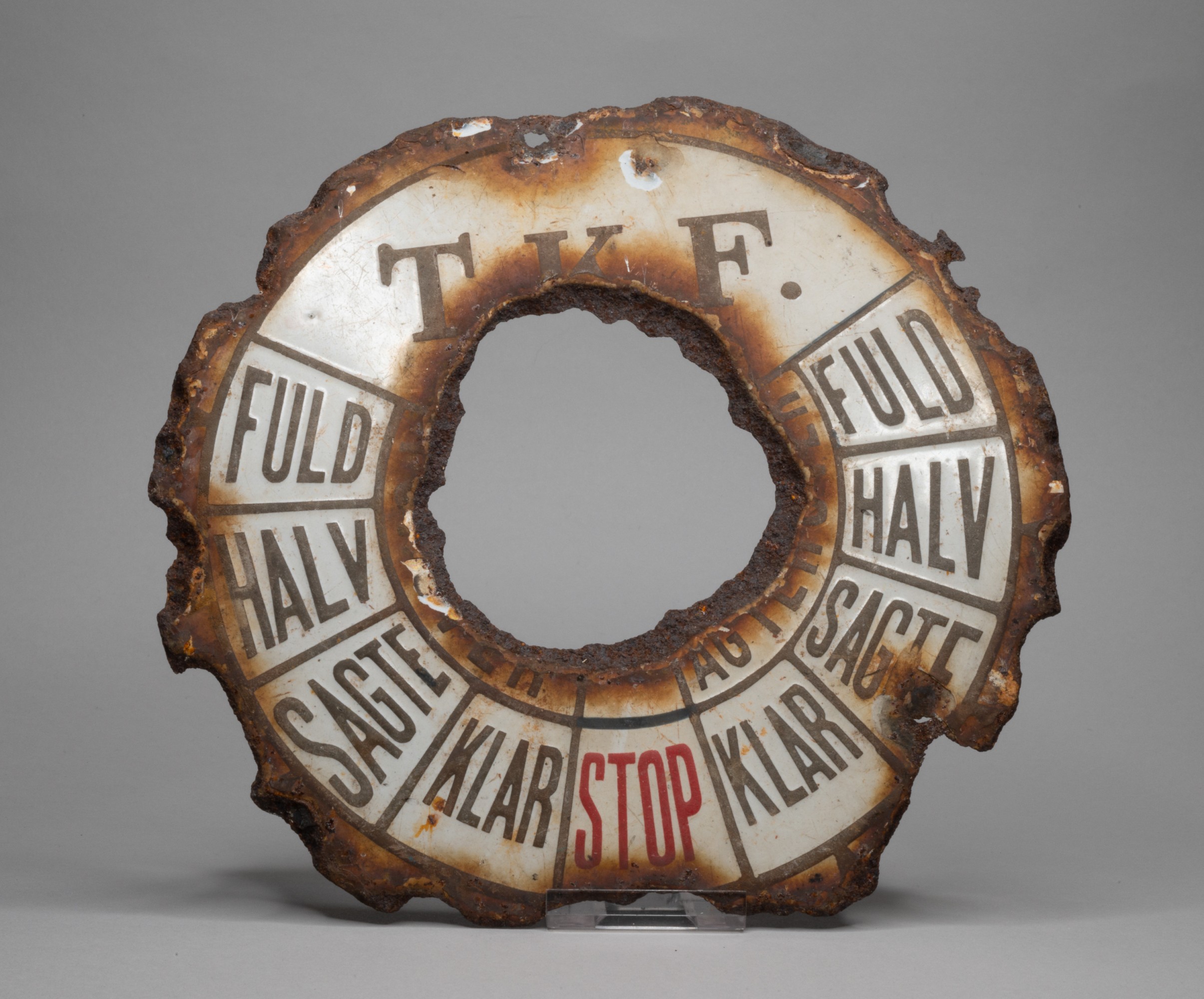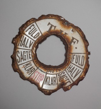 Metal plate from the telegraph of ship. It was washed up on the shore at Graemsay. Believed to be from the M V Norholmen.