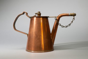 Copper methylated can with brass stopper for spout attached by chain and brass on top. Used for parafin lamp in lighthouse.