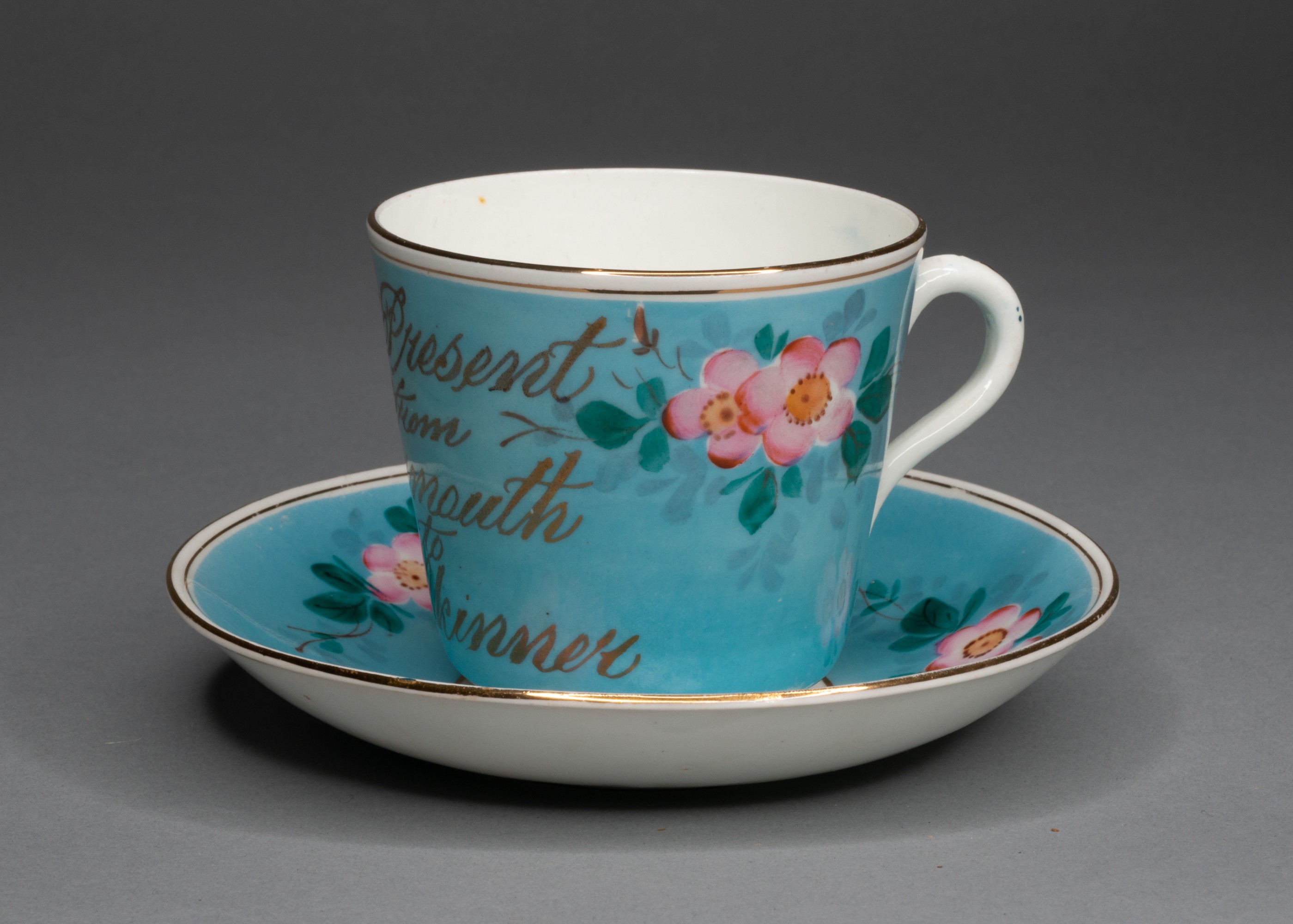 Saucer for matching tea cup, white china hand painted pink flowers on a blue ground. Gold lettering ' A Present from Yarmouth to Mrs Skinner'. Part of a tea set presented to Mary Jane Skinner of Quoys, Graemsay, in thanks for help and hospitality in allowing a Yarmouth herring boat skipper to dry nets on Quoys Shore.