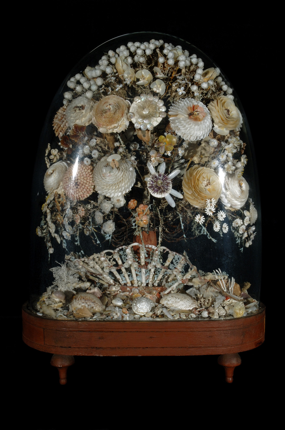 Domed case of flowers made from sea shells.