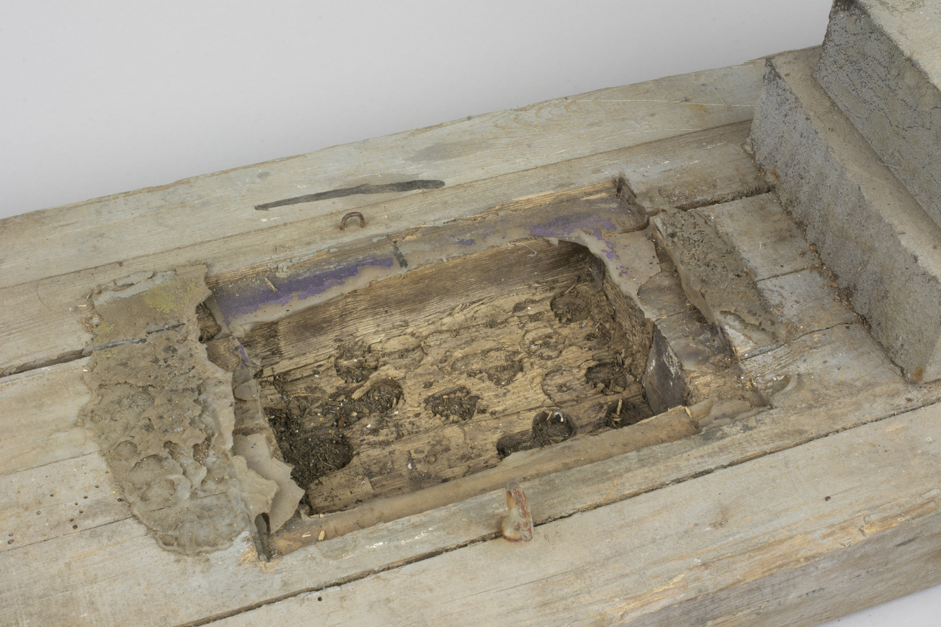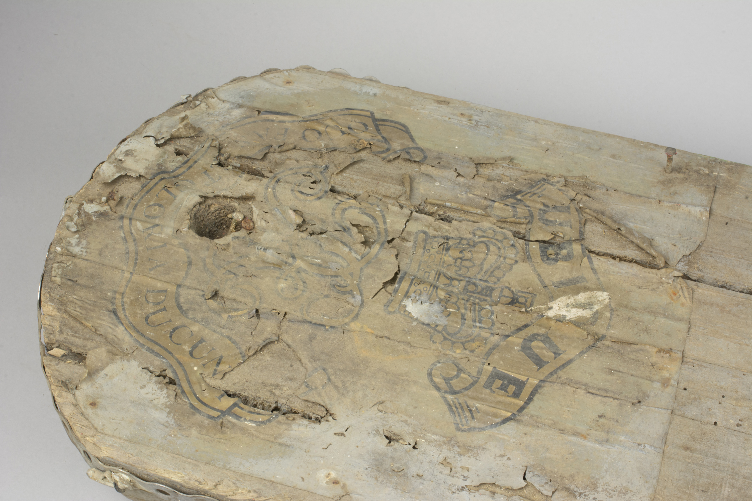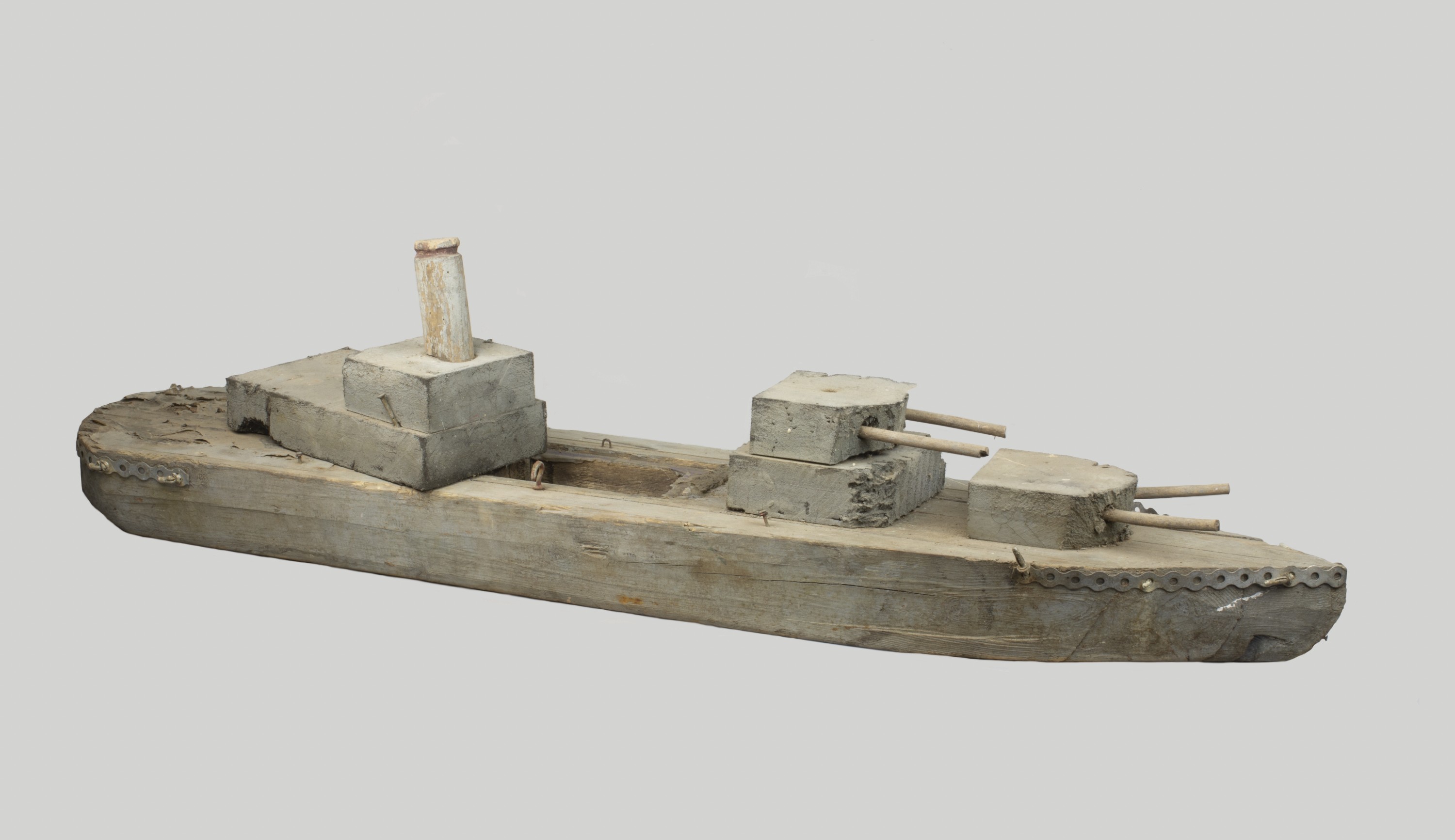 St Kilda Mailboat. Grey Naval vessel, with space in centre for mail. Used as a mailboat from St Kilda which was floated across the sea to be picked up somewhere on the west coast of Orkney. Found on the Birsay shore.