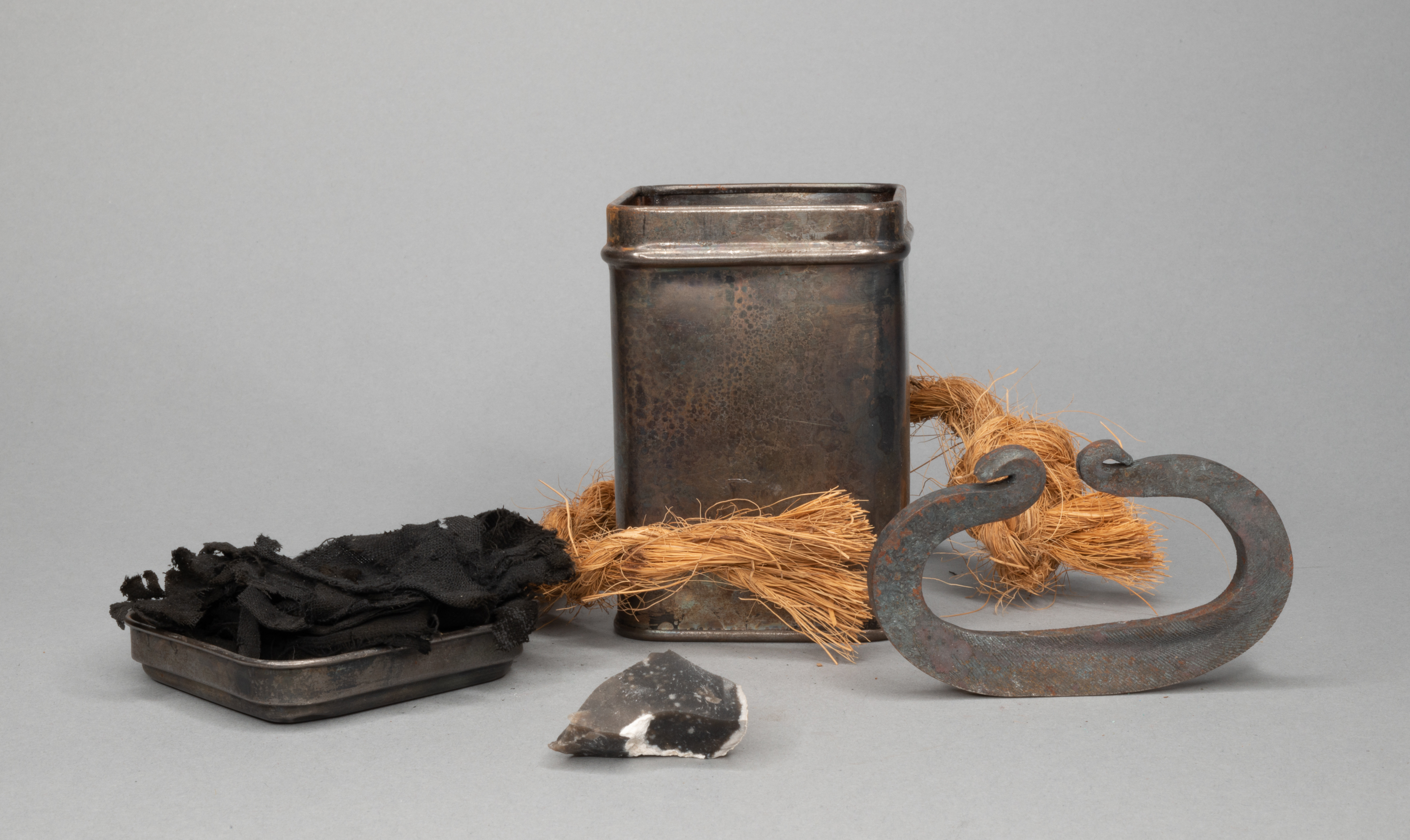 Fire strike set consisting of metal tinder box, striker, churd, char cloth. A trade item of Hudson's Bay Company. Length: 50 mm. Width: 50 mm. Height: 85 mm.