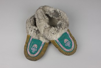One of a pair of moccasins. Fur lined with green panel on front decorated with a pink and blue beadwork flower. Worn condition.