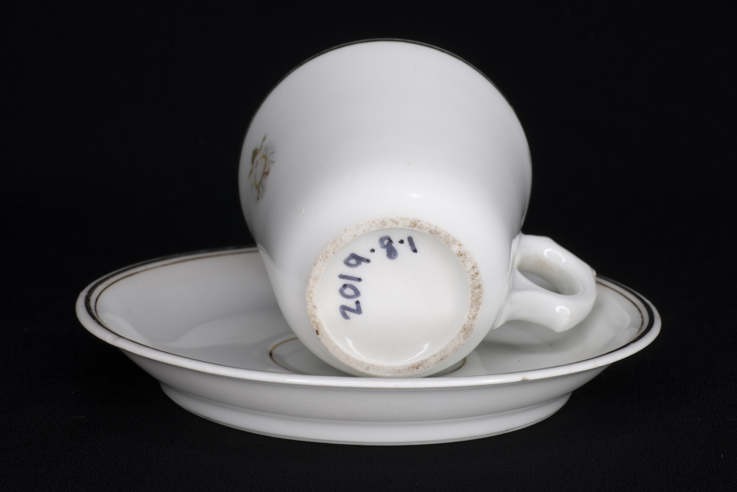 Small china saucer for a coffee cup with German eagle crest from German Fleet. Gold and black line decoration around the rim. Donors Father used to work in salvage industry in Scapa Flow.