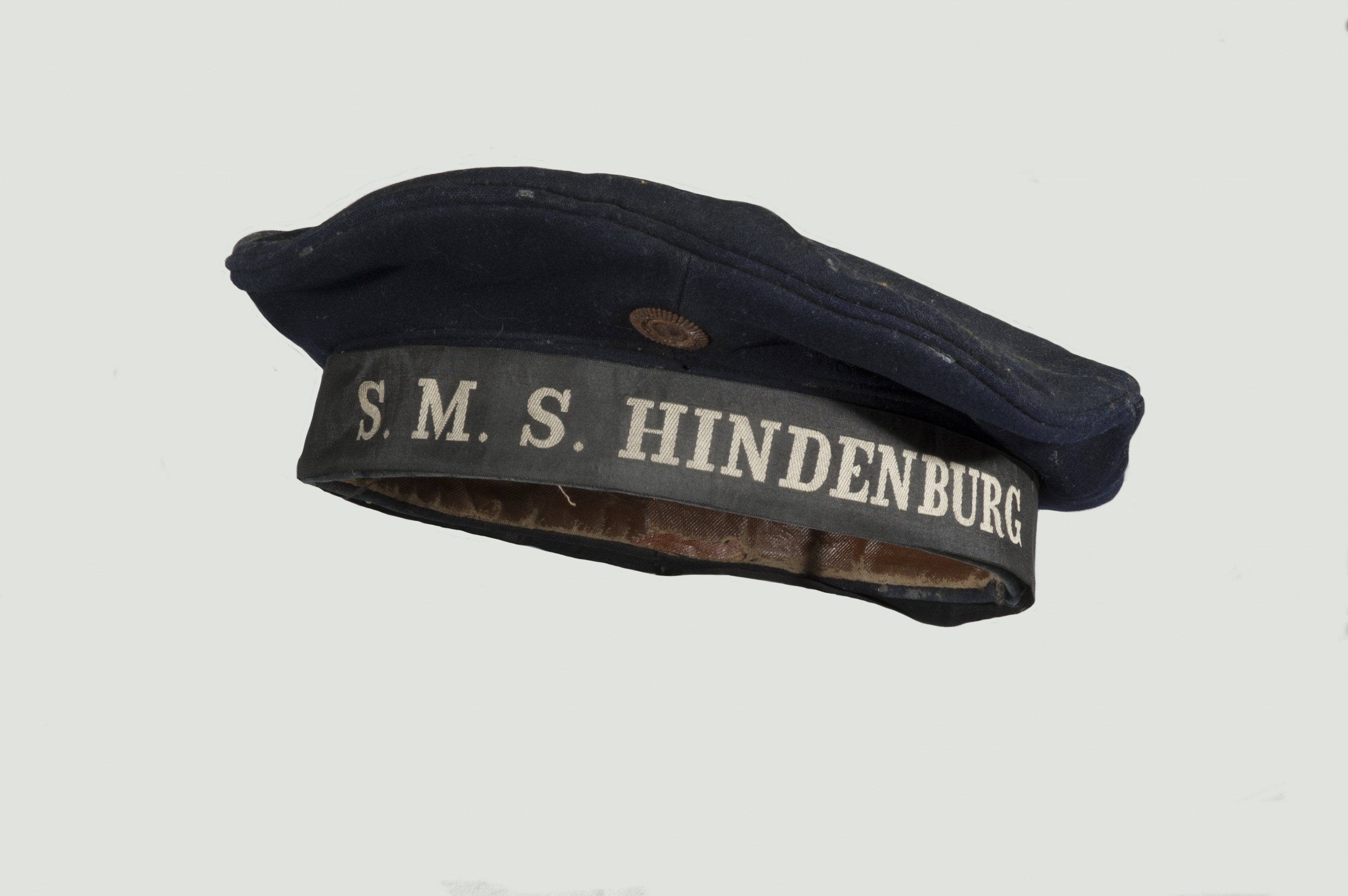 Navy blue cloth cap from German Navy with cap band or tally SMS Hindenburg. Stamp inside cap 'BAK. 31 7 16' tag hand stitched in with 'Bus' red embrodery IMB 748/17 with chin strap paper label added with '7B9' in blue ink.