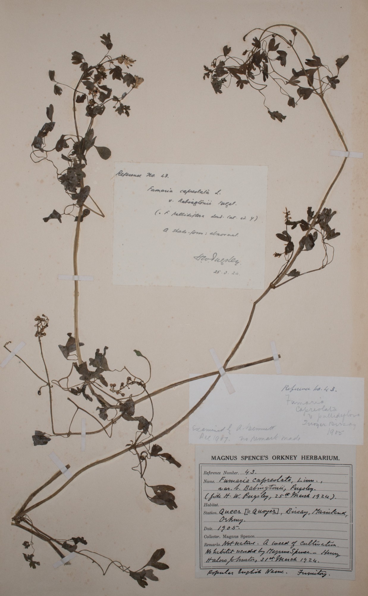 Herbarium sheet reference 43 Fumaria capreolata L. var. babingtonii Pugsley Fumaria capreolata L. subsp. babingtonii (Pugsley) White Ramping Fumitory.