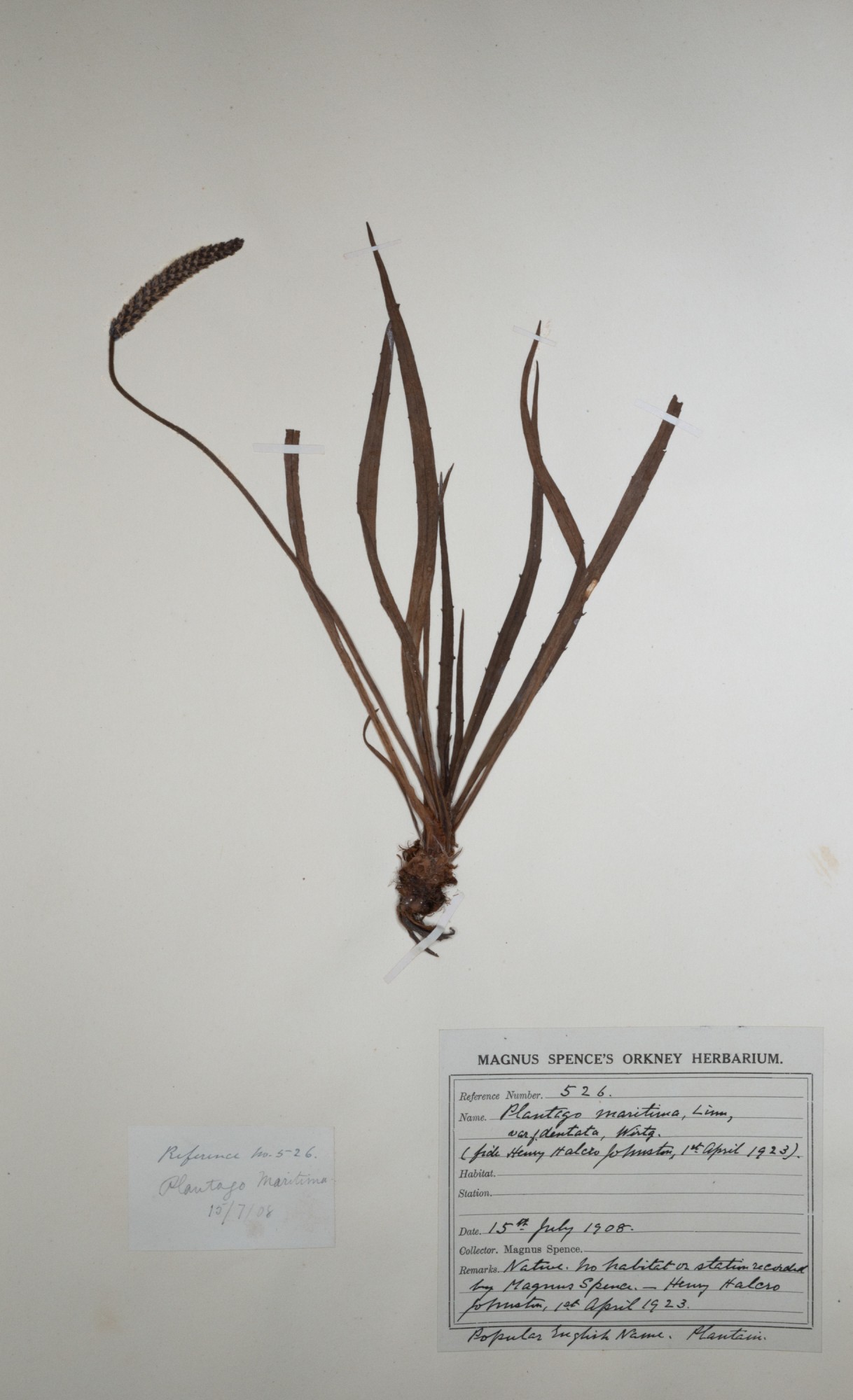 Herbarium sheet reference 526 Plantago maritima var. dentata Wirtg. Plantago maritima L. Sea Plantain.