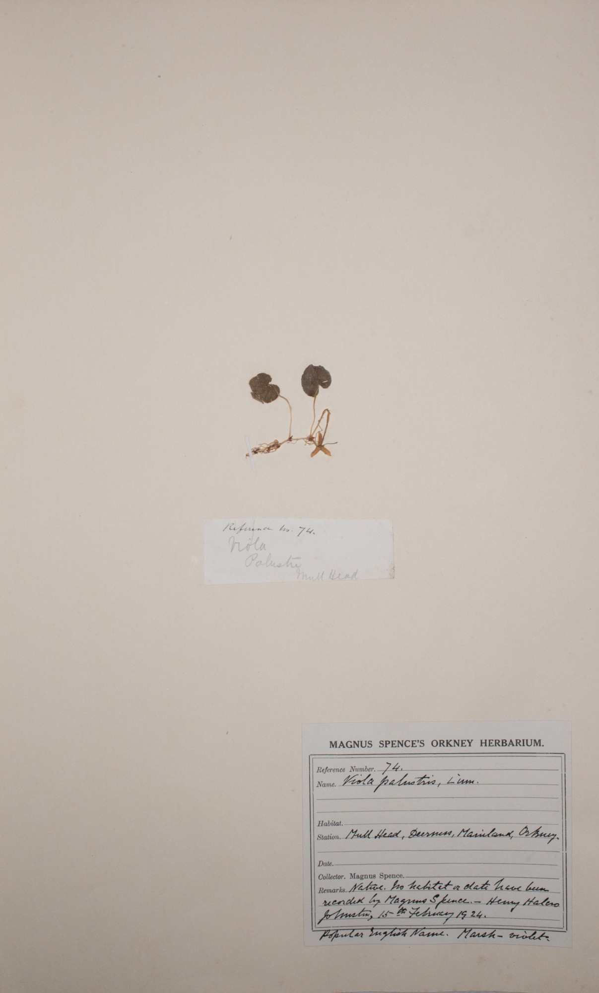 Herbarium sheet reference 74 Viola palustre L. Viola palustris L. Marsh Violet.