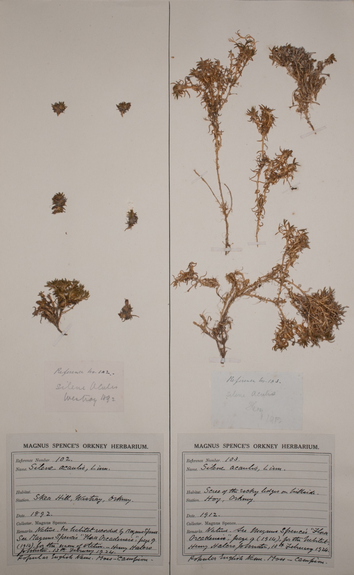 Herbarium sheet reference 102 Silene acaulis L. Silene acaulis (L.) Jacq. Moss campion.