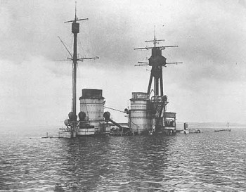 SMS Hindenburg resting on the Scapa Flow seabed after the scuttling of the German High Seas Fleet in 1919. The Hindenburg was eventually salvaged by Cox & Danks Ltd. on 22/7/1930.